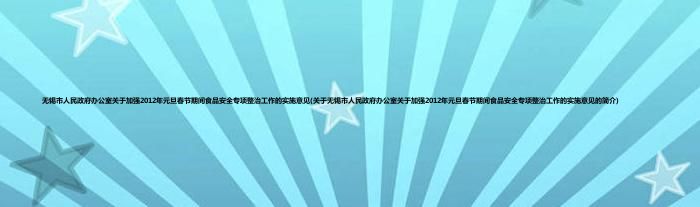 大家好,无锡市人民政府办公室关于加强2012年元旦春节期间食品安全专项整治工作的实施意见,关于无锡市人民政府办公室关于加强2012年元旦春节期间食品安全专项整治工作的实施意见的简介很多人还不知道,现在让我们一起来看看吧!